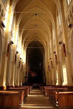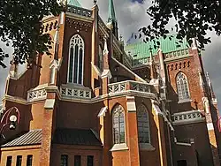 Projekt kostela vypracoval v roce 1900 architekt Konstanty Wojciechowski jako impozantní stavbu monumentálních rozměrů, jednu z největších v tehdejším Polsku. Katedrála je trojlodní, postavená z cihel, v architektonických detailech je použit kámen. Boční lodě jsou otevřeny arkádami se čtyřbokými pilíři a zaklenuté Křížovými žebrovými klenbami. Oblouková okna v kněžišti a transeptu jsou zasklená vitrážemi. Klenba transeptu, lodi a kněžiště je podepřená na opěrných obloucích, zdobenámi arkádovými vlysy a zakončenými balustrádami. Střechy kostela byly projektovány strmé, vpředu a nad transeptem rámované trojúhelníkovými štíty rozdělenými prolnutím. Délka kostela měla být 100 m, výška lodi 27 m, šířka transeptu 46 m, šířka lodni 32 m a výška obou věží asi 80 m každá.