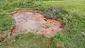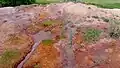 Mimořádně pestře zbarvené jsou živé Červené terasy. Železo z minerálních pramenů má přímý vliv na barevné tónování travertinu od téměř bíle přes žlutou, pomerančovou až po rumělkově červenou, případně hnědou. Nejsytější tóny červené jsou v blízkosti vývěrů minerálního pramene, ve větší vzdálenosti od něj blednou. V zimě je obsah železa vyšší a povrchové vrstvy travertinu jsou červenější, v suchém létě je kaskáda nejsvětlejší. V sedmdesátých letech 20. století život Bílých teras ukončil hydrogeologický vrt. Na základě tohoto zásahu zanikly minerální prameny a ustala tvorba bílého travertinu. Na okraji kamenolomu se nachází útvar Kaplnka.