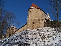 Původní hrad byl dvoudílný. Tvořilo jej menší obdélné předhradí na severu a příkopem oddělené hradní jádro. Do předhradí se vstupovalo protáhlou branskou věží nejasného středověkého stáří. Západní stranu chránila hradba a později u ní vznikla budova. Podle starších popisů v předhradí stála, nejspíše v severovýchodním nároží, také věž, kterou nechal v roce 1580 zbořit Baldassare Maggi.[8]