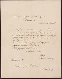 Jako první kapelník Prozatímního divadla zastával Smetana významné společenské postavení a účastnil se řady národně politických akcí. Tak se v červenci 1868 účastnil národní pouti do Kostnice nebo v roce 1870 pouti do Borové při příležitosti odhalení Havlíčkovy pamětní desky.[162] Nejvýznamnější pro něj byla slavnost položení základních kamenů Národního divadla 16. května 1868. Při poklepu na kámen pronesl Smetana později proslavené heslo „V hudbě život Čechů“, dokládající zvláštní význam hudby v procesu české národní emancipace v 19. století.[163]