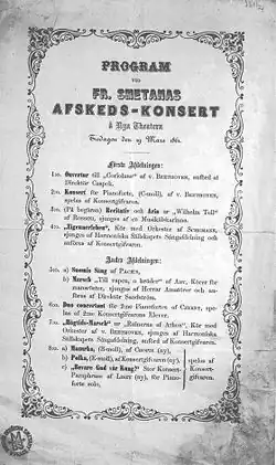 Se Švédskem se rozloučil sérií koncertů v březnu až květnu roku 1861 (Stockholm, Norrköping, Göteborg) a hudebně též kompozicí koncertní etudy Vid strandem (Am Seegestrande, Na břehu mořském).[89] Návrat do Čech nebyl zprvu definitivní, Smetana se naposledy pokusil prosadit jako klavírní virtuos vystoupeními v Německu a Nizozemsku, avšak s finančním neúspěchem, který musel zhojit novým kratším pobytem v Göteborgu (březen až květen 1862).[90][91][92] Veškerou svou další činnost již soustředil na Prahu.
