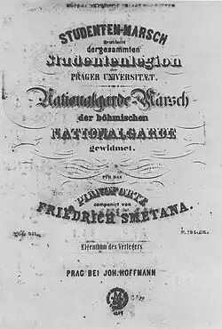 Při pražském povstání v červnu 1848 se Smetana, jenž udržoval styky s radikálními demokraty, nechal strhnout k účasti na barikádovém boji.[45] Napsal také dva příležitostné pochody, Pochod Národní gardy a Pochod studentské legie, které se staly jeho prvními skladbami vydanými tiskem,[46][47] jakož i revoluční Píseň svobody („Válka, válka! Prapor vlaje“) na slova Josefa Jiřího Kolára.[45] Po porážce povstání nakrátko uprchl k rodičům do Obříství, kde jej zastihlo příznivé vyřízení žádosti, a s finanční podporou rodičů a známých mohl od 8. srpna 1848 otevřít hudební ústav (klavírní školu) na Staroměstském náměstí v Praze.[5][48]