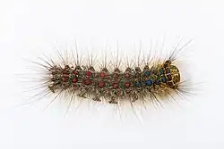 Housenka je od vylíhnutí hustě chlupatá, v prvním instaru prakticky celá černá.[10] Později se pokožka zbarvuje do šedožlutého mramorování, zpravidla s jedním až třemi světlými podélnými proužky na zádech. Výrazným znakem jsou bradavky, které vyrůstají na hřbetě ve dvou řadách. Prvních pět párů (tři hrudní a první dva zadečkové) je zbarveno modře, zbytek červeně. Z bradavek vyrůstají svazky černých štětinek.[7][10] Mohou se vyskytovat různě zbarvené formy, od zlatavě ochlupených až po výrazně tmavé až černé.[11] Hlava je u starších housenek velmi nápadná, zpravidla světle hnědá až žlutá, lehce tmavě kropenatá, se dvěma výraznými, svislými, černými pruhy v „obličejové“ oblasti.[4] Na konci vývoje mohou housenky měřit 5–8 cm,[7][10] přičemž housenky samičího pohlaví jsou zpravidla větší a světlejší.[4]