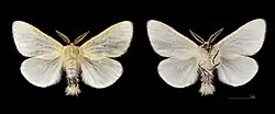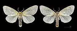 Délka předního křídla se pohybuje mezi 22–26 mm, přičemž samci jsou o něco menší. Základní barvou celého těla je smetanově bílá, pouze tykadla a oči jsou černé a nohy černobíle pruhované. Křídla mají hedvábný lesk. Tělo a končetiny jsou pokryté dlouhými bílými chloupky. Sosák je dlouhý a měkký, dobře vyvinutý. Pohlaví dospělců lze rozlišit podle tykadel – samci je mají dlouze hřebenitá, samice jen krátce.[1]