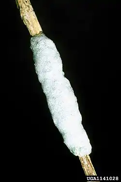 Kukla je leskle černá, pokrytá dlouhými, žlutavými chlupy.[1]