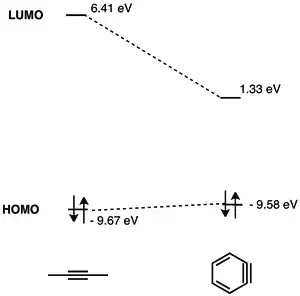 LUMO arynu má mnohem nižší energii než LUMO alkynu, u kterého není silné vnitřní napětí, díky čemuž lépe interaguje s HOMO nukleofilů. Benzyn je díky tomu elektrofilem a dobře reaguje s nukleofily.[5] Podrobná analýza MO benzynu byla publikována v roce 1968.[6]