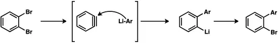 Za přítomnosti zásaditých nukleofilů se arylhalogenidy deprotonují v pozici alfa vzhledem k odcházející skupině, což vede k dehydrohalogenaci. Výsledky studií na základě výměny izotopů naznačují, že u arylfluoridů, a někdy i arylchloridů, probíhá eliminace ve dvou krocích, po deprotonaci dochází k odstranění nukleofilu; proces je tak podobný E1cB mechanismu u alifatických sloučenin. U bromarenů a jodarenů místo toho eliminace probíhá soustředěným synkoplanárním mechanismem.[13][14] Vzniklý benzyn vytváří adiční produkty, často nukleofilní adicí a následnou protonací. Tvorba benzynového meziproduktu je nejpomalejším krokem reakce.[15]