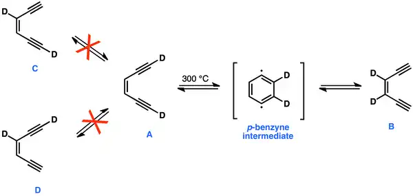 Při pokusech o přípravu 1,4-didehydrobenzenu, prováděných při teplotách okolo 300 °C, docházelo k vytvoření rovnováhy [1,6-D2]-As [3,2-D2]-B, ovšem nikoliv s C a D. Přesun atomů deuteria na B a skutečnost, že nedošlo ke vzniku C nebo D, lze vysvětlit pouze přítomností cyklického a symetrického meziproduktu–1,4-didehydrobenzenu.[28]