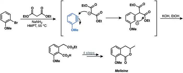 První případ reakce arynu vedoucí k připojení vazby sigma na molekulu byla příprava melleinu popsaná v roce 1973.[25]