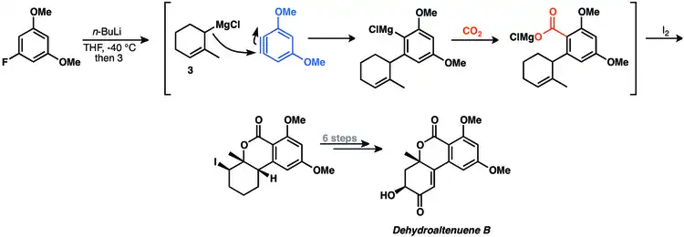 Vícesložkovými reakcemi arenů lze účinně a rychle připravovat 1,2-disubsituované areny. Při syntézách přírodních látek se však využívají jen ojediněle.[10] Při syntéze dehydroaltenuenu B se využívá čtyřsložková párovací reakce arynu.[33]