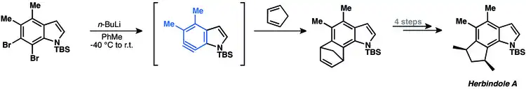 [4+2] cykloadice arynů se často využívají při totálních syntézách přírodních látek. Hlavním omezením těchto postupů je nutnost použití dienů s menšími cykly, jako jsou furan a cyklopentadien.[10] V roce 2009 byl takovýmto způsobem připraven herbindol A.[21] 6,7-indolyn reaguje s cyklopentadienem za vzniku tetracyklického produktu.