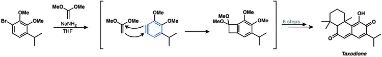 Vzhledem k tvorbě významných množství vedlejších produktů se arynové [2+2] cykloadice málokdy používají při přípravách přírodních látek, existují ovšem i takovéto případy. V roce 1982 byla popsána syntéza taxodionu s využitím [2+2] cykloadice arynu s acetalem ketenu.[23]