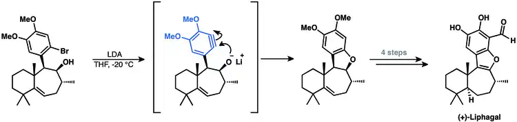 Při přípravě tetracyklického meroterpenoidu (+)-lifagalu také vzniká aryn.[32] Součástí je cyklizace vytvářející aryn, čímž vzniká poslední cyklická jednotka molekuly.[10]