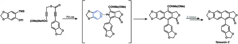 Také je možné provést palladiem katalyzovanou [2+2+2] kocykloadici arynu a diynu při syntéze taiwaninu C.[24]