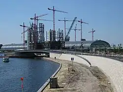 Jistým technickým unikátem jsou i dvě budovy s úřady, které visí napříč nad hlavní halou. Jejich konstrukce (celkem 2500 tun) byla napřed postavena vertikálně jako čtyři sloupy, které byly (zavěšeny na lanech) v červenci 2005 během dvou víkendů sklopeny rychlostí 68 metrů za hodinu.