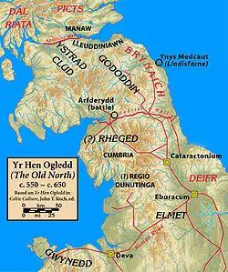 - ↑ The Gododdin of Aneirin: text and context from Dark-Age North Britain. Příprava vydání John T. Koch. [s.l.]: University of Wales Press, 1997. Dostupné online. ISBN 978-0-7083-1374-9. Poznámka 566, s. 216. (anglicky)