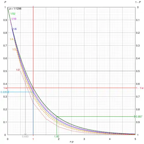 Modrá křivka: Při 6 vrzích kostkou je 33,5% pravděpodobnost, že ani jednou nepadne 6 (nebo jiné dané číslo); je vidět, že pravděpodobnost, že ani jednou nedojde k události, která má při jednom pokusu pravděpodobnost 1/n, se zvyšujícím se n rychle konverguje k 0.