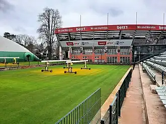 ![]() Dvorec č. 1 a fasáda stadionu Grafové, dva soutěžní kurty turnaje | |