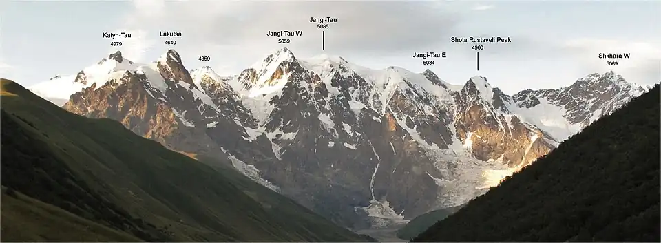 - Džangi-Tau (západní vrchol 5 058 m,[1] hlavní vrchol 5 059 m, východní vrchol 5 038 m)