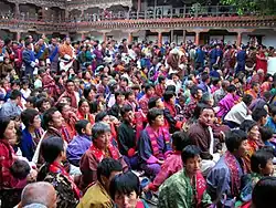 Obyvatelé Bhútánu se skládají především z Ngalopů a Šarlopů, nazývaných Západní Bhútánci, respektive Východní Bhútánci. Ačkoli Šarlopové jsou demograficky o něco početnější, Ngalopové dominují v politické sféře, neboť král a politická elita patří k této skupině.[70] Ngalopská kultura je úzce spřízněna s tibetskou. Totéž lze říci o Šarlopech, největší skupině, která tradičně vyznává spíše Ňingmapu než oficiální formu tibetského buddhismu Drukpa Kagjü. V moderní době, kdy se zlepšila dopravní infrastruktura, dochází mezi těmito skupinami k četným sňatkům.