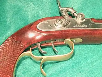 - Německý napínáček vypadá jako dvě spouště za sebou. Zadní jazýček ovládá napínáček a přední jazýček je vlastní spoušť.