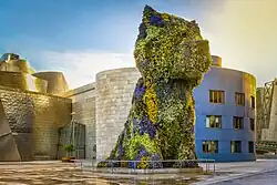 - Přes most Puente Zubizuri se dostaneme ke Guggenheimovu muzeu, postmodernistické stavbě se zděnou ocelovou konstrukcí a pláštěm z kovových plátů a skla; byla dokončena roku 2007, podle návrhu architekta Franka Gehryho. Před ní je šestnáctimetrová betonová socha psa s dutinami, osazenými skalničkami a květinami. Za muzeem stojí nejvyšší budova Bilbaa Iberdrola (Torre Iberdrola, baskicky Iberdrola dorrea), z let 2007–11 od architekta C. Pelliho (autor Petronas Twin Towers v Malajsii) má 165 m.