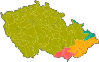 | západokarpatská podprovincie | Ždánicko-Litenčický (3.1) • Chřibský (3.2) • Hlucký (3.3) • Hranický (3.4) • Podbeskydský (3.5) • Bělokarpatský (3.6) • Zlínský (3.7) • Hostýnský (3.8) • Vsetínský (3.9) • Beskydský (3.10) • Kojetínský (3.11) | |