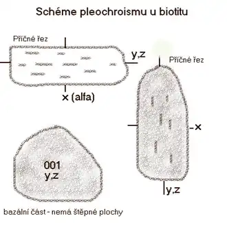 - Optické – Biotit je dvojosý minerál, který se ale opticky chová jako minerál téměř jednoosý, jelikož úhel optických os je velmi malý. Při pozorování biotitu pozorujeme silně se projevující pleochroismus podle osy x (tzn. napříč štěpností), která je typicky slámově žlutá (případně až hnědožlutá), podle y a z (ve směru bazální štěpnosti, oba dva směry jsou si rovnocenné) má barvu hnědou až rezavou, červenohnědou až temně hnědou. Dvojlom je střední až vysoký v rozmezí od 0,030 až 0,080. Interferenční barvy mohou být maskovány a nemusí se na první pohled objevit. Mají intenzivní barvu. Blízko polohy zhásnutí se řezy projevují jako poseté jemnými šupinkami, což je způsobeno při přípravě výbrusu.