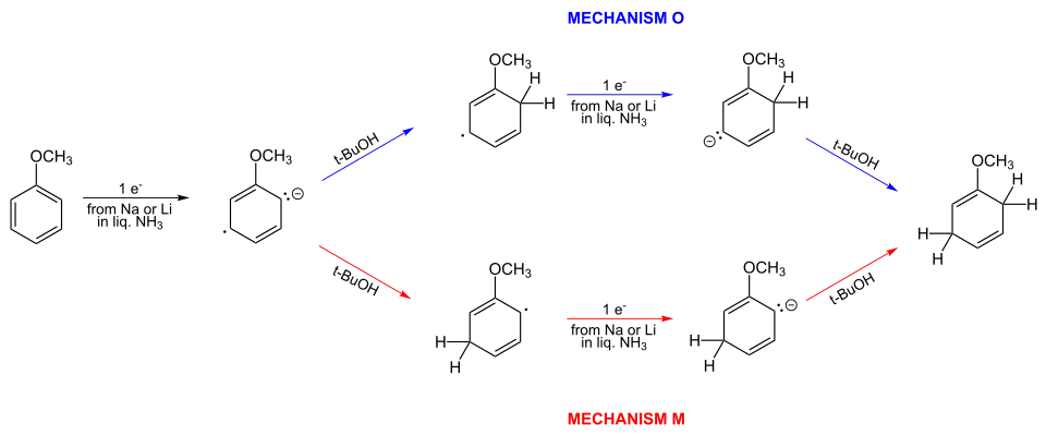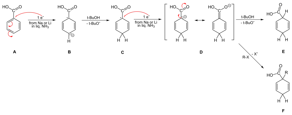 - V kapalném amoniaku se alkalické kovy rozpouštějí za vzniku modrého roztoku, o němž se zjednodušeně předpokládá, že má „volné elektrony“. Tyto elektrony jsou aromatickým kruhem postupně absorbovány. Jakmile je absorbován první elektron, vzniká radikálový anion. Následně molekula alkoholu uvolní hydroxylový vodík a vytvoří se nová vazba uhlík-vodík, čímž vznikne radikál. Následně je absorbován druhý elektron za tvorby karbaniontu cyklohexadienylového typu (tedy C=C-C-C=C v šestičlenném cyklu se záporným nábojem). Následně je tento cyklohexadienylový anion protonován za přítomnosti alkoholu. K protonaci dochází ve středu cyklohexadienylového systému. Takováto regioselektivita je charakteristická.