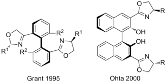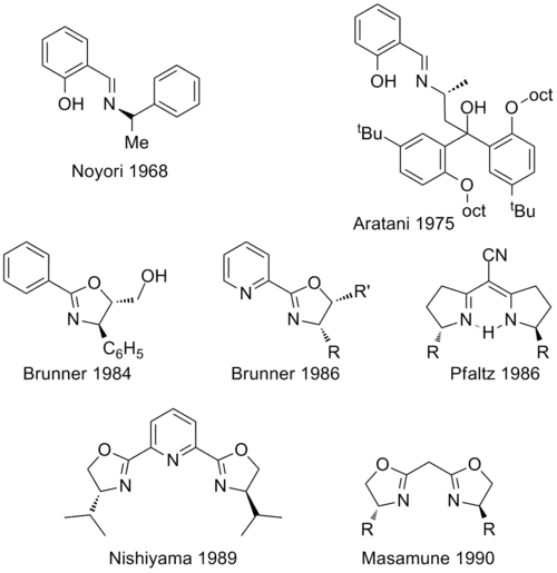 Oxazolinové ligandy byly vyvinuty v roce 1984 jako asymetrické katalyzátory, kdy se spolu se Schiffovými zásadami ukázaly jako účinné katalyzátory enantioselektivních karbenoidových cyklopropanací.[19] Schiffovy zásady byly v této době důležitou skupinou ligandů; použil je Rjódži Nojori v roce 1968 při výzkumu asymetrické katalýzy[20]. Tadatoši Aratani, který spolupracoval s Nojorim,[21] na základě tohoto výzkumu provedl ještě předtím řadu enantioselektivních cyklopropanací pomocí oxazolinů.[22][23][24]