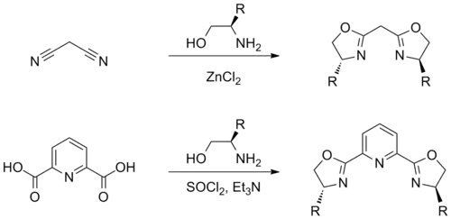 K rozšířenosti BOX a PyBOX přispělo i to, že se dají snadno připravit v jednom kroku reakcí malononitrilu s kyselinou dipikolinovou, které jsou snadno dostupné. Chiralita se do nich zavádí prostřednictvím aminoalkoholů (například valinolu), které jsou chirální díky tomu, že se připravují z aminokyselin, jež již obsahují chirální centra.