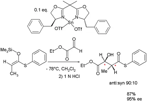 Navázáním Lewisových kyselin obsahujících meridiálně tridentátní PyBOX ligandy se utváří čtvercově pyramidální komplexy. Ve studii využívající (benzyloxy)acetaldehyd jako elektrofil bylo zjištěno, že stereochemie odpovídá navázání karbonylového kyslíku ekvatoriálně a etherového axiálně.[9]