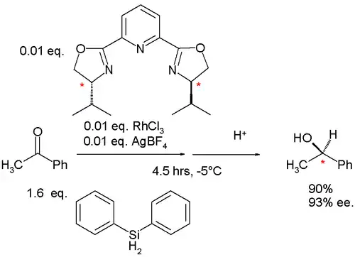 - ↑ a b c NISHIYAMA, Hisao.; SAKAGUCHI, HISAO.; NAKAMURA, TAKASHI.; HORIHATA, MIHOKO.; KONDO, MANABU.; ITOH, KENJI. Chiral and C2-symmetrical bis(oxazolinylpyridine)rhodium(III) complexes: effective catalysts for asymmetric hydrosilylation of ketones. Organometallics. 1989, s. 846–848. doi:10.1021/om00105a047.