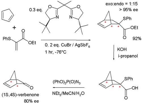 - ↑ EVANS, David A.; MILLER, SCOTT J.; LECTKA, THOMAS; VON MATT, PETER. Chiral Bis(oxazoline)copper(II) Complexes as Lewis Acid Catalysts for the Enantioselective Diels−Alder Reaction. Journal of the American Chemical Society. 1 August 1999, s. 7559–7573. doi:10.1021/ja991190k.