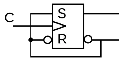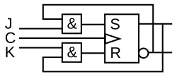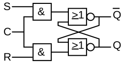 Doplněním dalších dvou členů AND zapojených jako blokování vstupů lze realizovat synchronní variantu tohoto klopného obvodu. Obvod tak bude reagovat na vstupy pouze po dobu a nebo pouze v době, kdy je hodinový signál C ve stavu log.1. Pokud je vstup signálu C vybaven detekcí náběžné hrany, bude se stav výstupů měnit pouze v okamžiku náběžné hrany signálu.