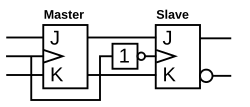 JK Master-Slave je klopný obvod tvořený dvěma klopnými obvody JK. První master (nadřízený člen), druhý slave (podřízený člen). Princip činnosti je v tom, že klopný obvod má kaskádně zapojeny vstupy J, K. Vstup Clk (není značen) řídí stav jednotlivých obvodů následovně: master reaguje na vzestupnou hranu, Slave na sestupnou hranu společného signálu Clk. Master má vstupy J, K a Clk, výstupy jsou přivedeny na vstupy Slave, jehož výstupy teprve vedou na výstup celého klopného obvodu. Při vzestupné hraně signálu Clk master načte data (stav J, K), ale na výstupu slave se objeví až při sestupné hraně signálu Clk.