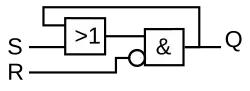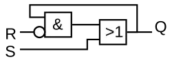 RS klopný obvod lze realizovat pomocí dvou dvouvstupých hradel typu NAND nebo NOR.[1] Výstup prvního členu se vede do jednoho ze vstupů druhého členu, výstup druhého se vede do jednoho ze vstupů prvního. Druhé vstupy členů slouží jako vstupy R a S. V případě RSKO sestaveného z členů NAND jsou tyto vstupy aktivní v logické nule.