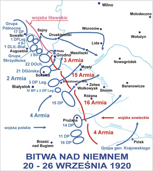 Porážka Rudé armády v půlce srpna 1920 v bitvě u Varšavy byla okamžikem obratu v polsko-sovětské válce. Střed ruské frontové linie se tehdy zcela zhroutil a generálu Tuchačevskému nezbylo nic jiného než nařídit celkový ústup k řece Bug. Organizované stahování ale znemožňovala ztráta komunikace mezi jednotlivými zbytky armády a fakt, že již před bitvou u Varšavy Poláci dokázali odposlouchávat bolševickou komunikaci. I přes velký polský úspěch potřeboval generál Piłsudski čas na reorganizaci svých vojsk a tuto dobu využili bolševici na opevnění pozic na řece Němen. Obranná linie se táhla od Litvy přes husté lesy a bažiny Polesí s městem Grodno jako opěrným bodem.