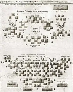 Stavovské vojsko se rozložilo nedaleko pražských hradeb na návrší Bílá hora, které k severu a západu prudce klesá zhruba o 50 výškových metrů do údolí Litovického potoka. Pravé stavovské křídlo se opíralo o vysokou zeď rozsáhlé obory u letohrádku Hvězda a levé křídlo bylo posíleno dělostřelectvem. Koncepce bojové formace, kterou vytvořil Anhalt na západní straně hory, se dá přirovnat k pružné šachovnici, kdy rozestavil svoji armádu do dvou řad s mezerami tak aby šiky z druhé řady mohly prostoupit dopředu. Do třetí potom umístil uherskou jízdu. Pět praporců jeho jízdy pak mělo předsunutou pozici kvůli pohybu do stran.[6] Muži byli děleni po praporcích čili kornetech. Podle tabulkových počtů by měl mít jízdní praporec po 100 mužích a pěší praporec třikrát více.