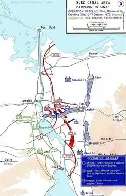 Plán, který dostal krycí název operace Gazela počítal s přesunem obřího válcového pontonového mostu do prostoru přechodu. Toto místo, nazvané Deversoir, kde Suezský kanál ústí do Velkého Hořkého jezera bylo již před rokem 1973 vytipováno jako místo pro případný přechod do Egypta a byly zde provedeny některé přípravné práce, včetně zeslabení pískového obranného valu a vybudování nástupního prostoru (tzv. dvůr). Toto místo se také nacházelo nejblíže k místu dotyku (tzv. švu) mezi 2. a 3. egyptskou armádou a zároveň s nejmenší koncentrací egyptských jednotek. Kolona s pontonovým mostem se měla přesouvat po Akavíšské cestě a Tirturské cestě, které spojovaly místo pro překročení kanálu s izraelskou vojenskou zásobovací základnou. Celý prostor, včetně přístupových cest byl ale nakonec blokován silným uskupením egyptské 2. a 3. armády, které se sem stáhly po neúspěšné ofenzivě.