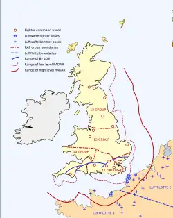 - ↑ Britské radarové řetězce Chain Home a Chain Home Low existující v době bitvy byly situovány na pobřeží a jejich antény orientovány směrem na moře, a Observer Corps tak představoval jediný prostředek sledování nalétávajících letadel poté, co překročila pobřeží.[14] První radary sledující letouny nad vnitrozemím Británie byly uvedeny do provozu v lednu 1941 a zpočátku sloužily k navádění nočních stíhačů v rámci systému Ground Control Interception.[15]