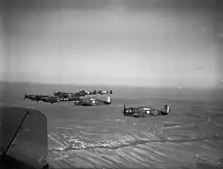 Formace lehkých bombardérů Fairey Battle od 88. squadrony RAF v doprovodu stíhacích Hawk H75 od 1e escadrille GC 1/2 Armée de l'Air v únoru 1940