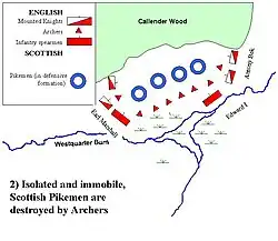 Podobný plán použil Robert Bruce v bitvě u Bannockburnu. Zde však díky tomu, že jeho jízda zničila anglické lukostřelce, skončila bitva drtivým vítězstvím Skotů.