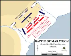 Bitva se odehrála při pobřeží na úzké planině u Marathónu. Střetly se v ní invazní síly Peršanů (dle odhadů 20 000–30 000 vojáků) s armádou Athén posílenou asi o 1000 Platajských (celkem snad 10 000–11 000 mužů). V čele řeckého vojska stál Miltiadés.[2] V čele Peršanů stáli Dátis a Artafernés. Bitva byla velkou vzpruhou pro řecké státy (především pro Athény) a ukázala jim, že Persii dokážou porazit.[3] Persie se s porážkou nechtěla smířit a následně naverbovala obrovskou armádu, která proti Řekům válčila v bitvě u Thermopyl či v bitvě u Salamíny (oboje 480 př. n. l.).