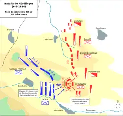 Po osmé hodině začala přebírat iniciativu císařská strana, která zahájila útok od severní šance směrem na Heselberg, jehož obsazením by protestantskou armádu rozsekla na dvě části. Vévoda Bernard zareagoval zvýšenou aktivitou svých jezdeckých jednotek proti pravému křídlu katolíků, nicméně v nastalé jízdní bitvě získali postupně navrch císařští a na věci nic nezměnilo ani když vévoda podpořil svou jízdu i částí pěchoty - nakonec musel s těžkými ztrátami ustoupit. Útok na Heselberg tak mohl nerušeně pokračovat a okolo 10. hodiny zde začala švédská obrana kolabovat.