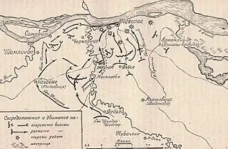 Severně od tohoto tábora levé kolony byly části Kavkazské kozácké brigády pod velením plukovníka Ivana Tutolmina se 6 děly. Jejich úkolem bylo sledovat cestu do vesnice Guljanci a přerušit spojení s vnějším světem. Asi ve 14 hodin obsadil plukovník Ivan Tutolmin vesnici Somovit a večer rozložil tábor na jih od vesnice.