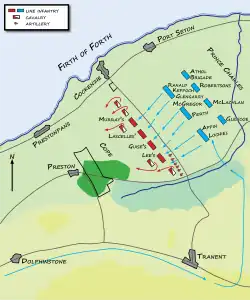 Generál Cope, který se u Dunbaru spojil s Fowkem a se svojí jízdou, byl přesvědčen, že je jeho vojsko dostatečně silné, aby porazilo chabě vyzbrojené jakobitské oddíly čítající méně než 2000 mužů.[4] Ve stejnou dobu nařídil Karel Eduard svým silám, aby se pohnuly z Edinburghu na východ. Obě armády se setkaly odpoledne 20. září. Cope rozmístil své jednotky čelem k jihu, aby je chránilo bažinaté území, které se rozkládalo přímo před nimi. Zprava je chránila zeď obory. Dělostřelectvo bylo rozmístěno za náspem vozové cesty z Tranetu do Cockenzie, která bojiště protínala od jihovýchodu k severozápadu.[5]
