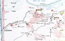 - kóta 70, 19 km od Romani, novozélandská střelecká brigáda (jen Wellingtonský jízdní střelecký pluk, ale s dočasným připojením 5. pluku lehké jízdy 2. brigády lehké jízdy), které velel Edward Chaytor a 5. jízdní brigáda pod přímým velením Lawrencea byla na železnici připojena k 126. pěší brigádě (East Lancashire) 42. divize. Spolu s 5. plukem lehké jízdy připojeným k novozélandské jízdní střelecké brigádě v Dueidaru východně od kóty 70 měla tato síla zastavit nebo zpomalit von Kressensteinův útok, pokud by se pokusil obejít Romani a postupoval by přímo k Suezskému průplavu.