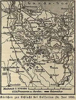Bitva u Solferina se odehrávala 24. června ve velkém prostoru a jednalo se prakticky o tři bitvy – u Solferina, u Guidizzola a u San Martina. Na straně rakouského císařství se jí účastnilo 126 tisíc mužů, spojená francouzsko-sardinská vojska měla 115 tisíc mužů. U San Martina si dokázali vytvořit Francouzi převahu a postupně vytlačovali rakouská vojska z pozic. U Solferina se začali rakouští vojáci stahovat pod mohutným tlakem kolem čtvrté hodiny odpolední. Ve středu sestavy se střetlo 57 000 Francouzů (včetně celé císařské gardy) s 40 000 Rakušany. Po úporných bojích v nepřehledném terénu, kde se nedokázaly uplatnit rakouské pušky, byl střed rakouské sestavy prolomen a levé křídlo poté začalo ustupovat. V šest hodin večer se sardinská vojska vrhla do nového útoku proti rakouskému pravému křídlu, ovšem marně. A to i přesto, že proti sboru Ludwiga von Benedeka s 25 000 vojáky útočilo 44 000 Piemonťanů. Kolem desáté hodiny večerní byl dán pokyn k ústupu rakouských jednotek z bojiště. Bitva trvala 15 hodin a vyčerpaná francouzsko-sardinská vojska již neměla sílu pronásledovat stejně vyčerpaného nepřítele. Vítězství Francouzům v bitvě přinesly rojnice, bodáky a děla.