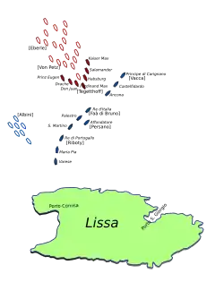 Zatímco Persano shromáždil své lodě v nepravidelné kýlové linii vhodné pro dělostřelecký souboj, Tegetthoff nehodlal bojovat způsobem, který by byl pro něj naprosto nevýhodný. Namísto toho vedl své lodě ve třech divizích kolmo na nepřátelskou sestavu. Persanovi nějakou dobu trvalo, než pochopil, že nepřítel nepřistoupí na dělostřelecký souboj, ale že ho hodlá taranovat. Když mu to došlo, pokoušel se vydat rozkazy pro změnu sestavy, ale z výše zmíněných důvodů neuspěl.